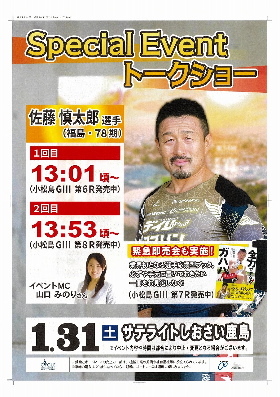 ☆スペシャルトークショー「佐藤慎太郎選手(福島78期)&山口みのりさん」トークショー@13時頃〜 A13時53分頃〜B抽選会ありC佐藤慎太郎選手のファンブック特売会D一般の写真撮影会あり