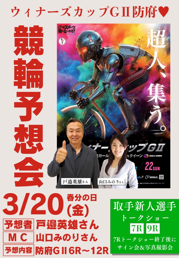 2026 年 03 月 20 日 ☆競輪予想会「戸邉英雄さん&山口みのりさん」 防府G2 6R〜12Rの予想を行います☆