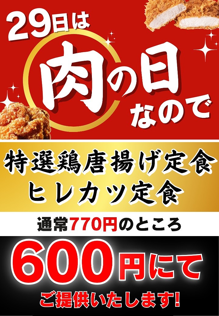 2026 年 4 月 29 日 ☆食堂ファンサービス 「肉の日」(毎月29日)☆